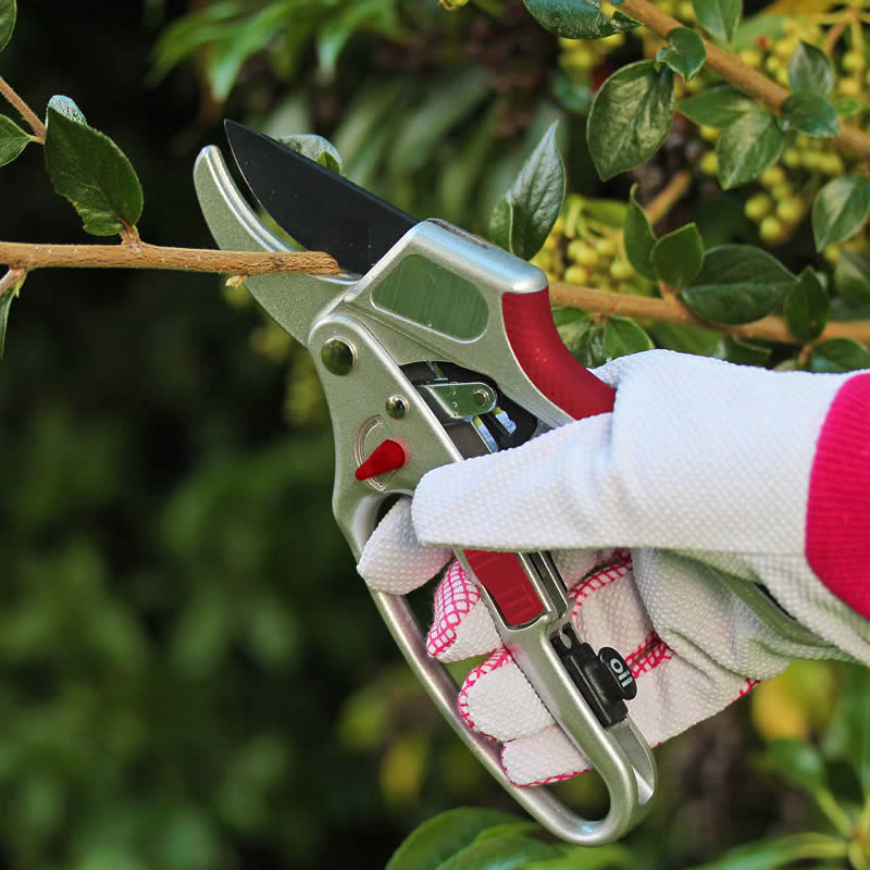 • Храповия режим Ви позволява да направите четири кратки разреза на един клон. Това прави рязането на дебели клони много по – лесно с минимално усилие. Просто следвайте четирите стъпки: Стиснете, Чуйте щракването, отпуснете и повторете