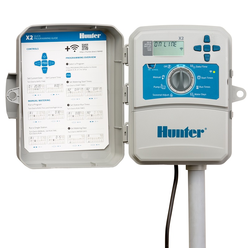 Програматорът продължава наследството, изградено от полулярния модел на HUNTER INDUSTRIES X-Core®. Подобен набор от надеждни и високоефективни възможности, но за разлика от X-Core® , X2 променя стандартите за централизирано управление на поливната система, като предлага това управление да става дистанционно, чрез Wi-Fi връзка, с помощта на Hydrawise приложение, което можете да намерите в App Store или Google Play, посредством вашето смарт устройство. Wi-Fi управлението става чрез присъединяване на допълнителен модул към програматора(не е включен в комплекта), програматорът работи и без модул към него, но без Wi-Fi управление.